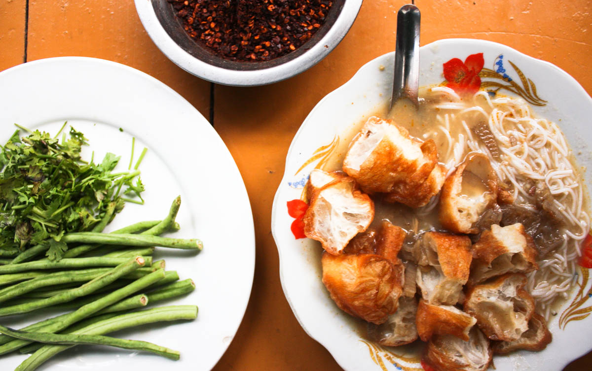 魚のだしを使ったにゅうめん。ビルマの国民食と言えるほど、あちこちで食べられる。