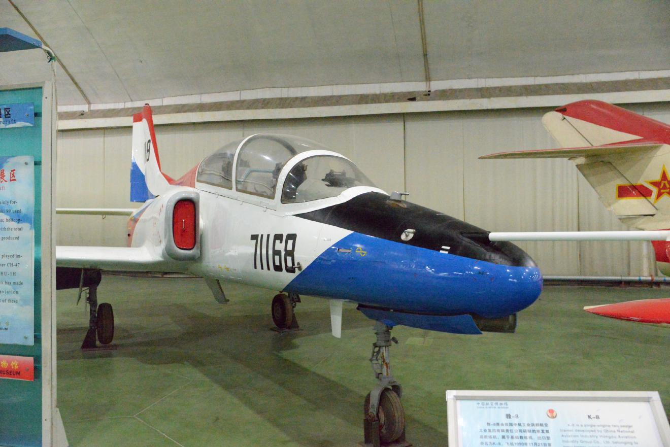 教-8(K-8)です。中航工業洪都航空工業集団有限責任公司が作った単発複座機です。基礎訓練機として作られ、1990年11月21日に初飛行し、中国と他国との共同開発の先駆けとなりました。多くの国に輸出されました。