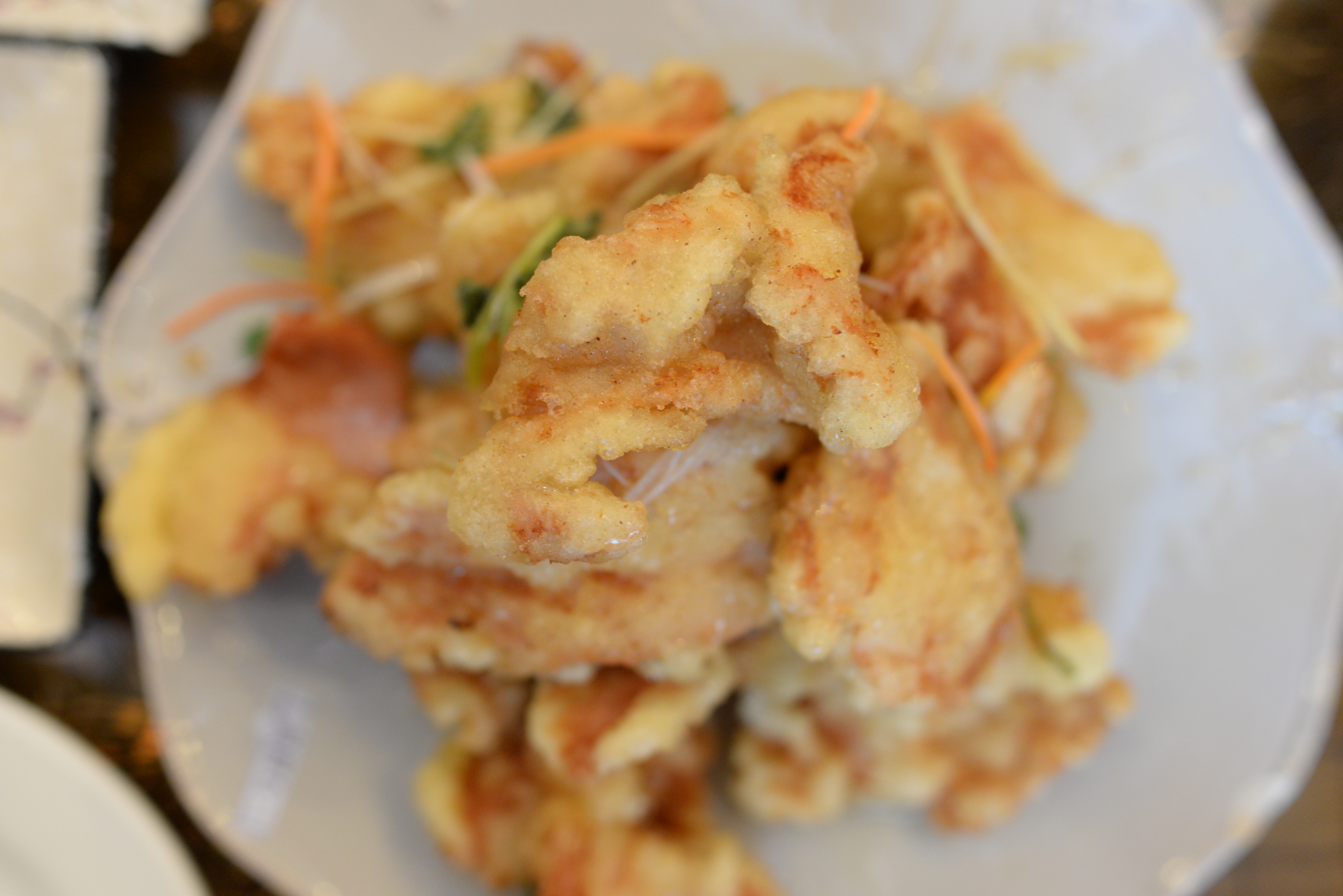 豚バラ肉をあげたものに、甘酢あんをかけたもの。