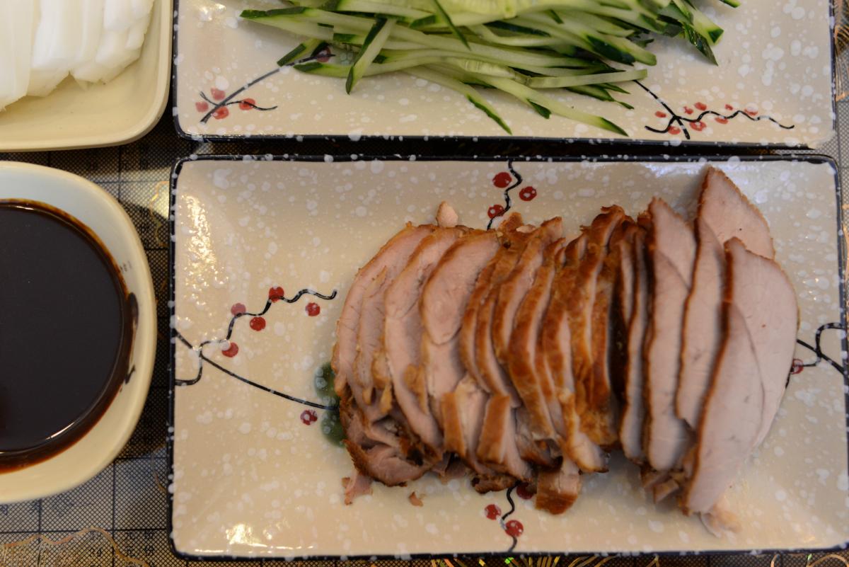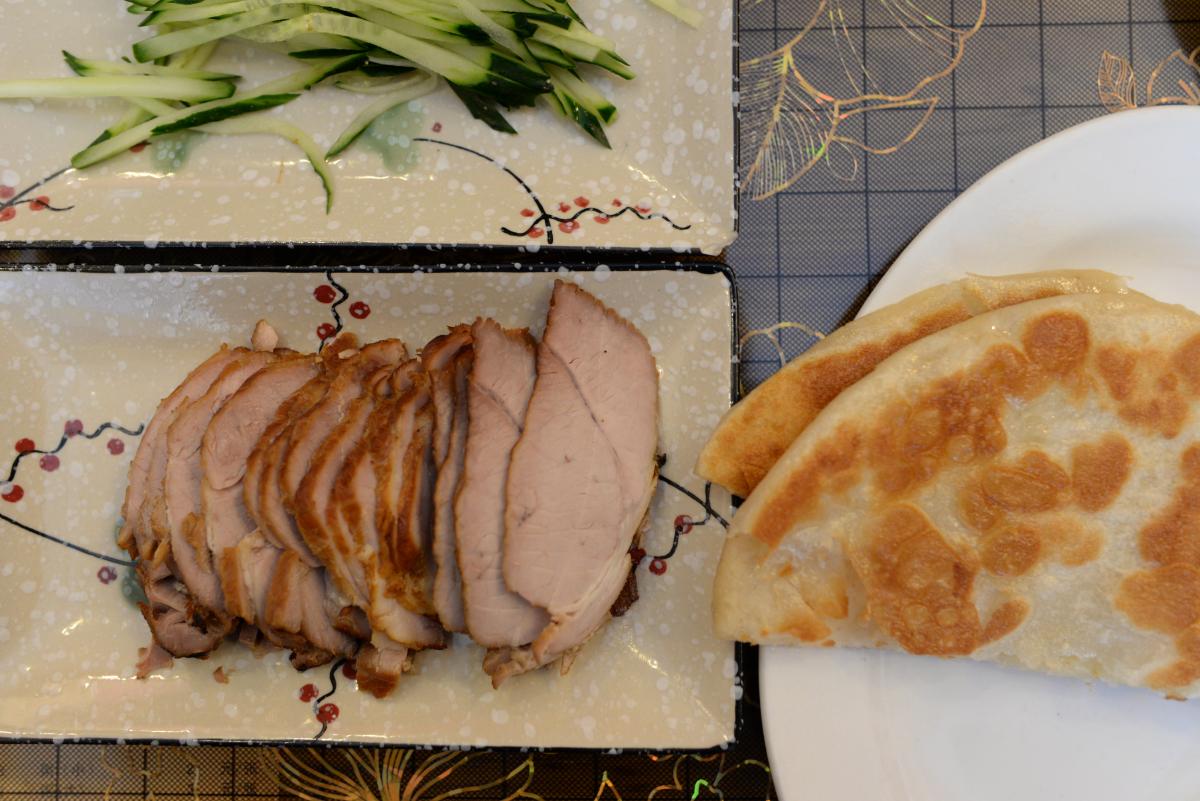 ほのかな煙の味がする肉を、味噌やキュウリ、ネギと一緒に食べる。